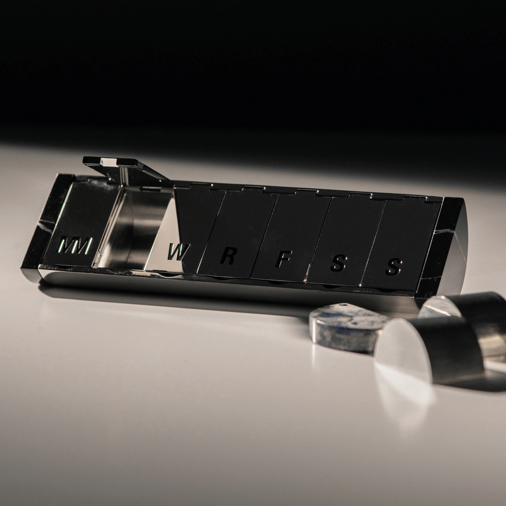 A modern, elevated reimagining of the weekly pill case constructed from premium materials, featuring a distinct semi-cylinder shape and satisfying weight and feel. Magnet closures on each daily compartment allow the object to be positioned face down for a more discreet look.